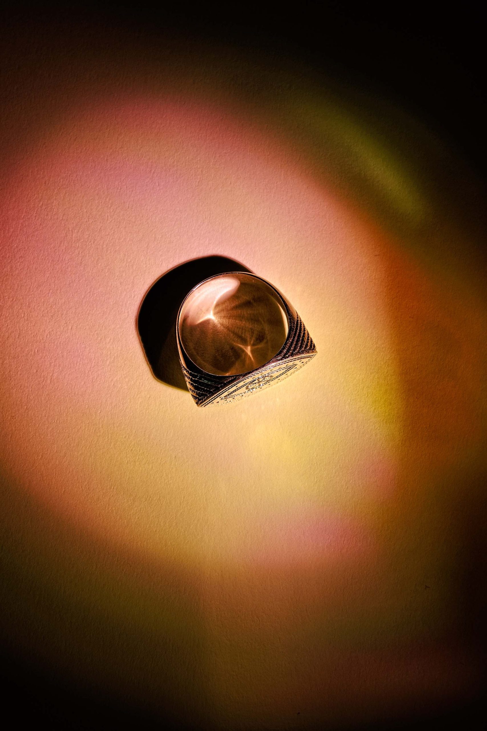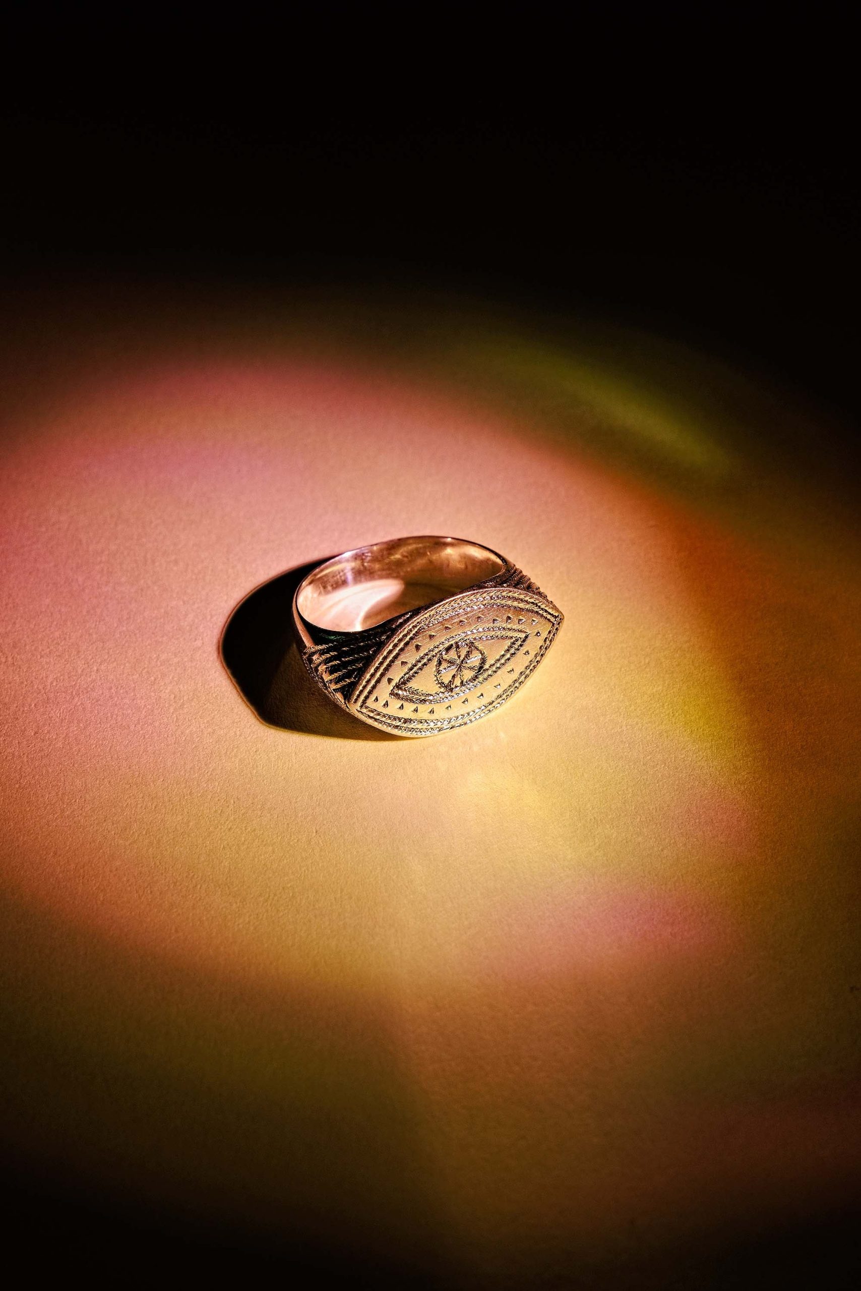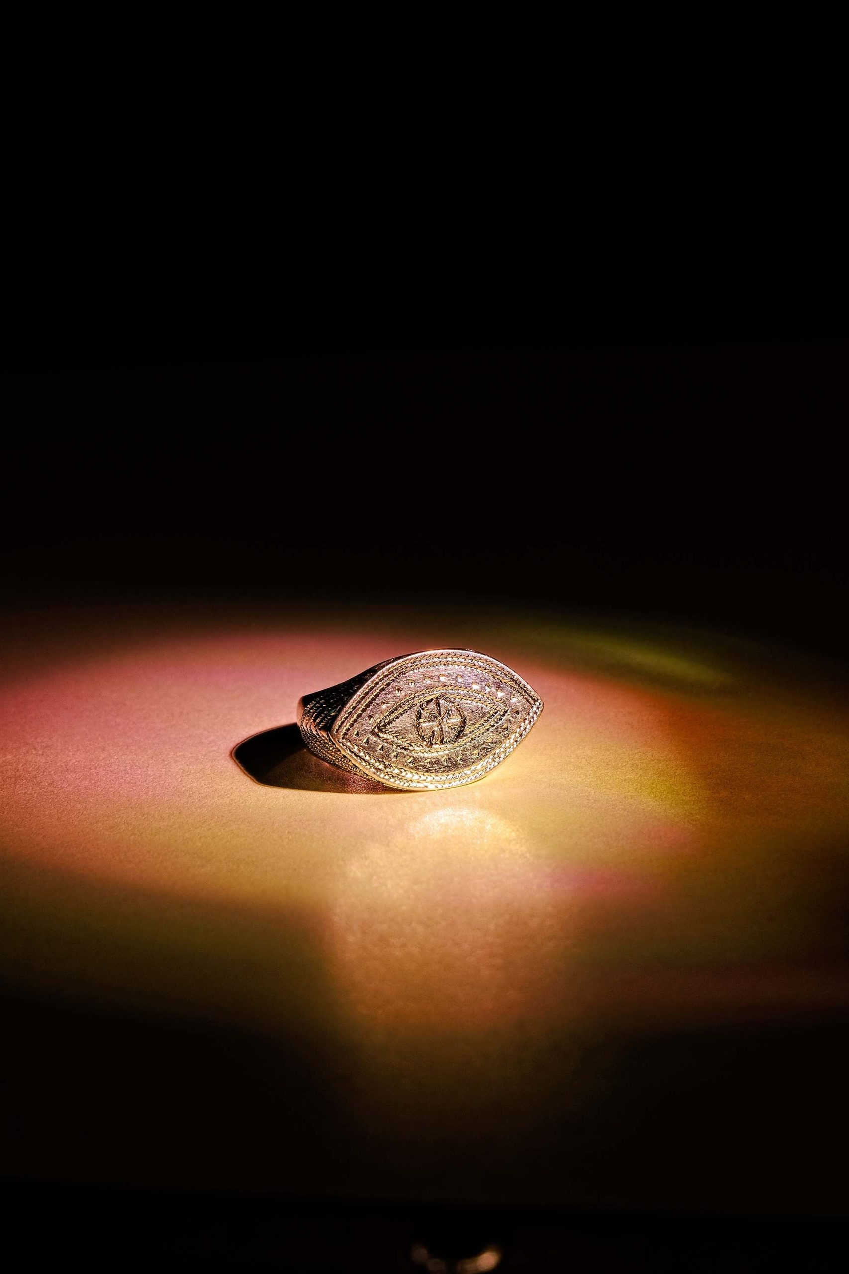 L’histoire de la bague Charly se tisse autour de l’œil au centre de la bague, qui agit comme une armoirie. Ce regard, symbolique et puissant, semble scruter le monde et, par son énergie, propager des motifs délicats tout au long de l’anneau. Une véritable pièce maîtresse, où chaque détail a été pensé pour transmettre une vision et une profondeur uniques.