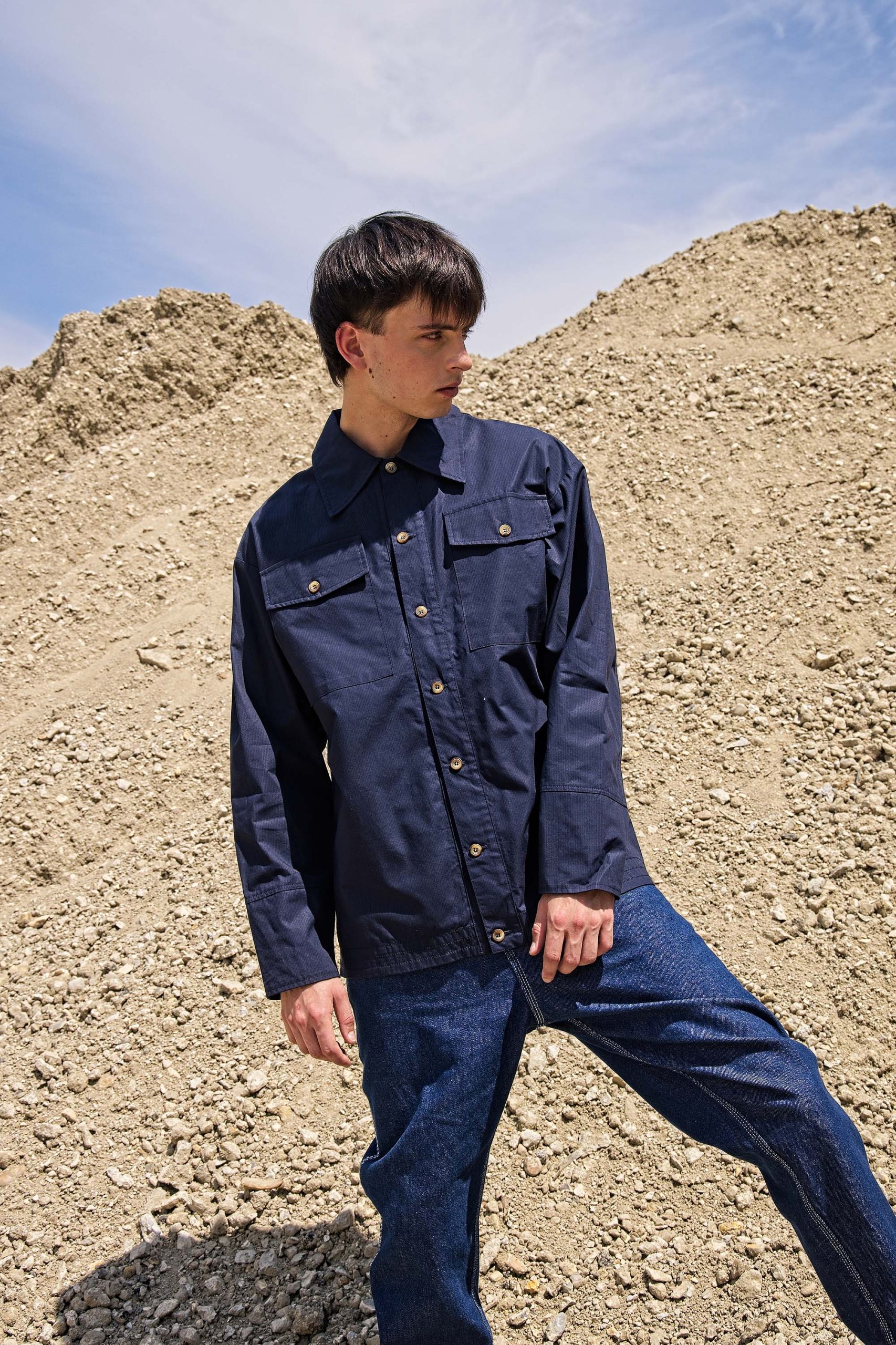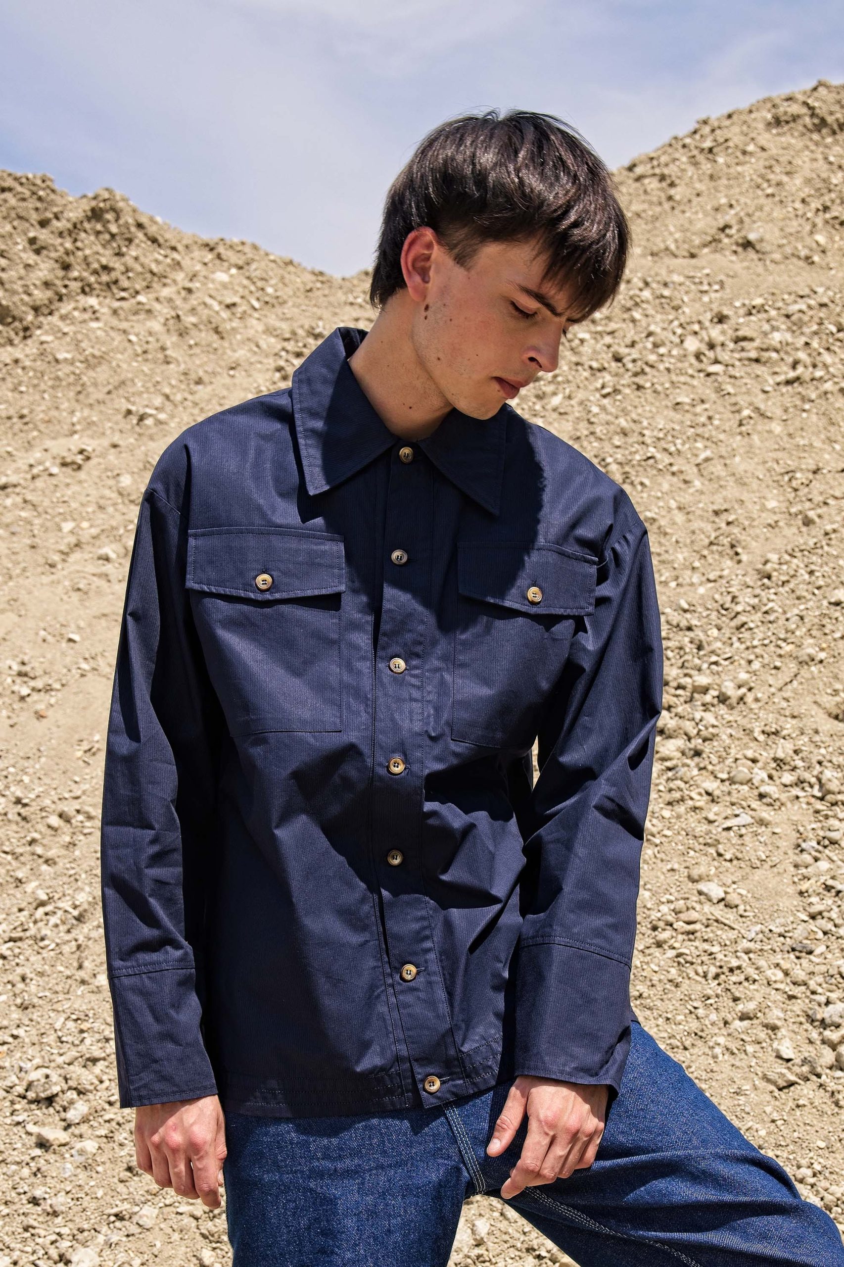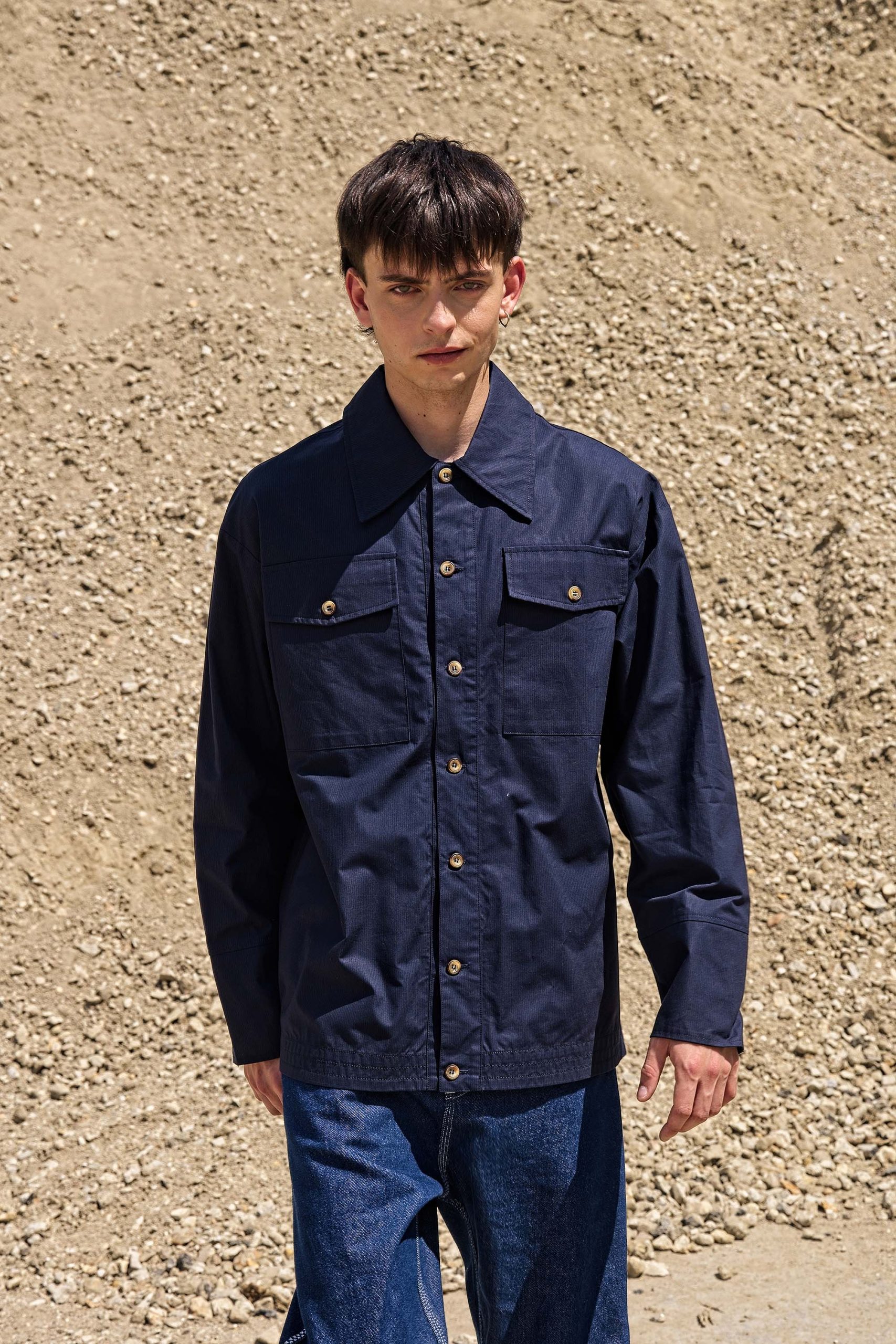 CHEMISE BLEU MARINE EN COTON ÉPAIS COL LARGE POCHES PLAQUÉES A RABAT