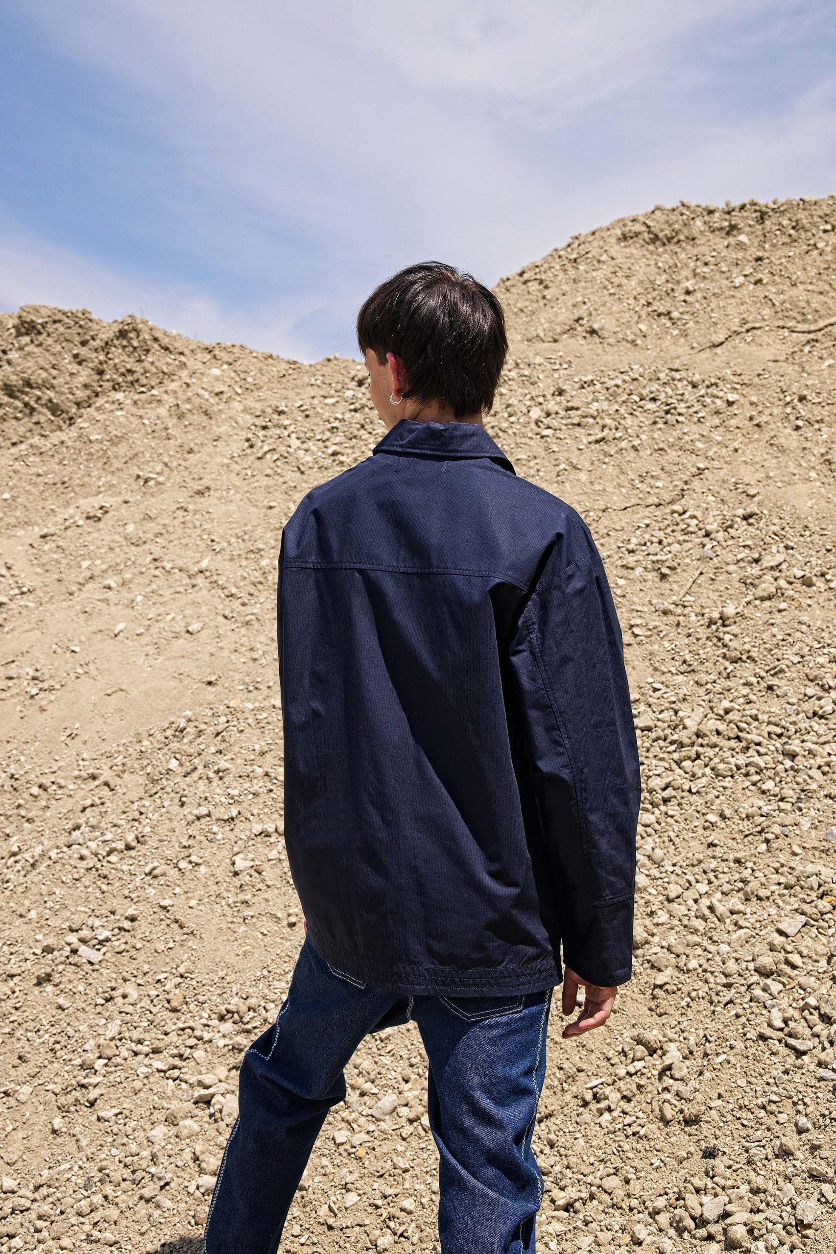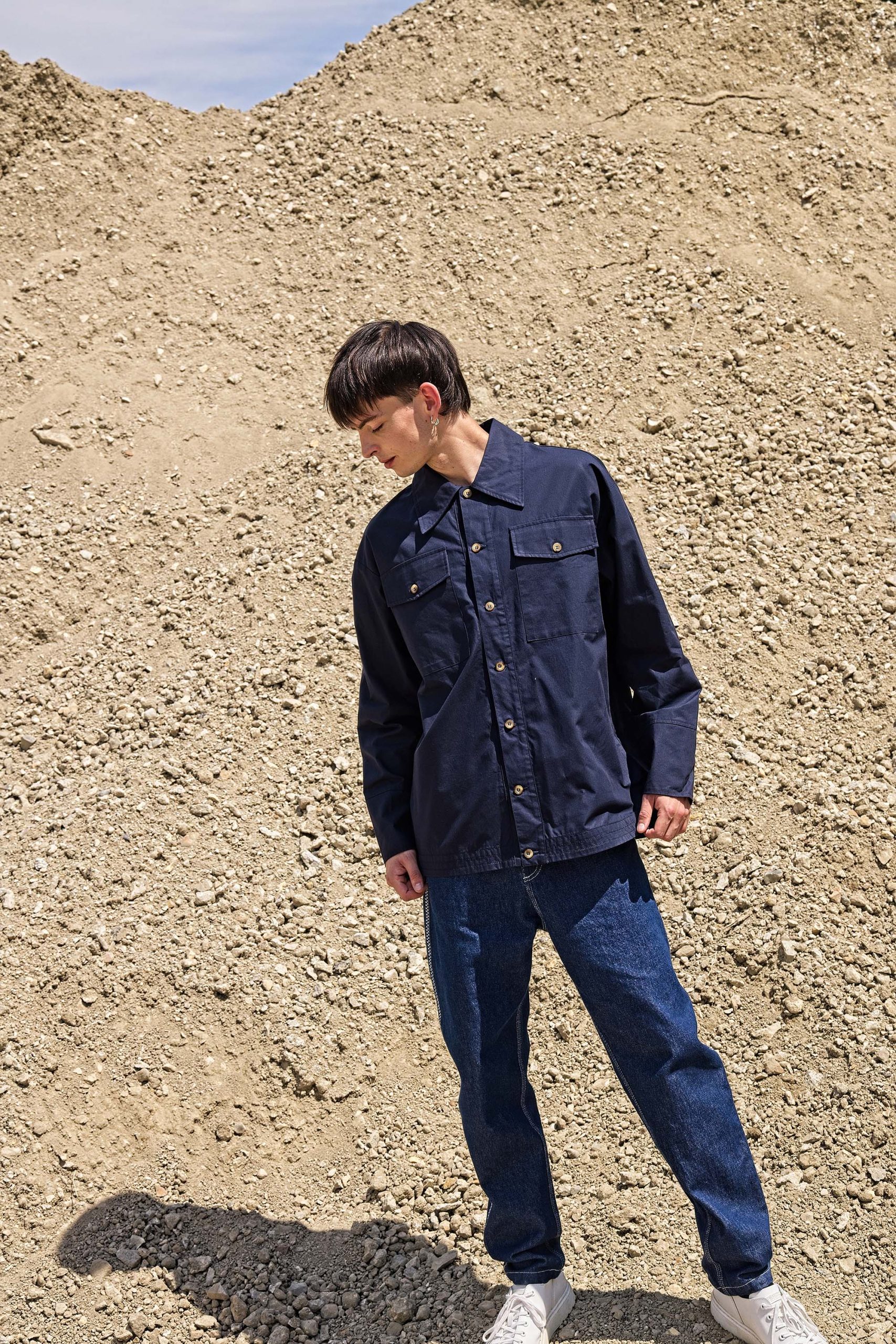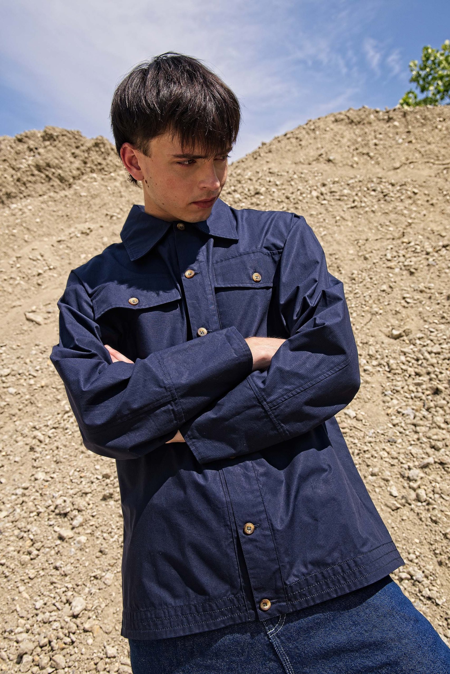 CHEMISE BLEU MARINE EN COTON ÉPAIS COL LARGE POCHES PLAQUÉES A RABAT