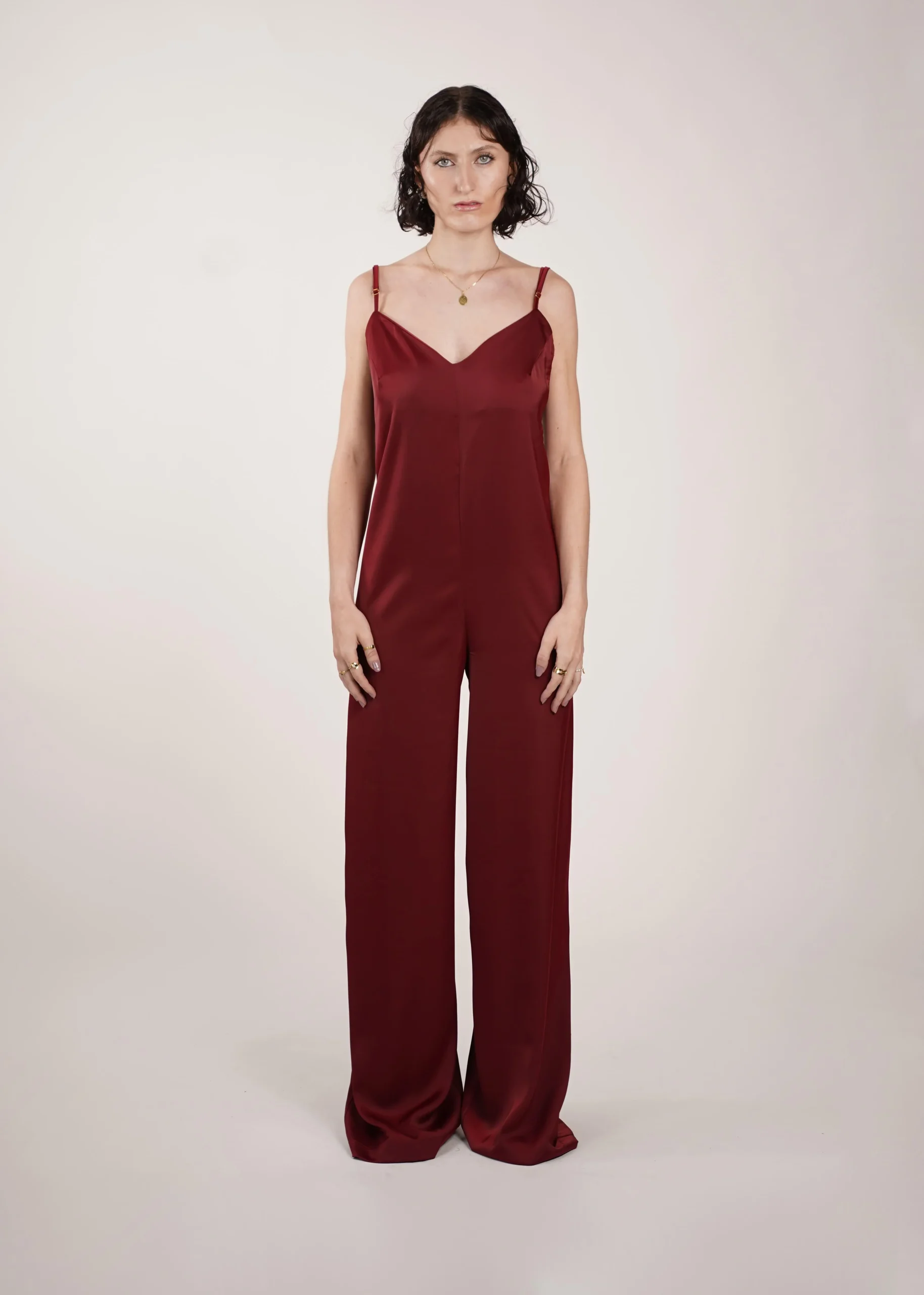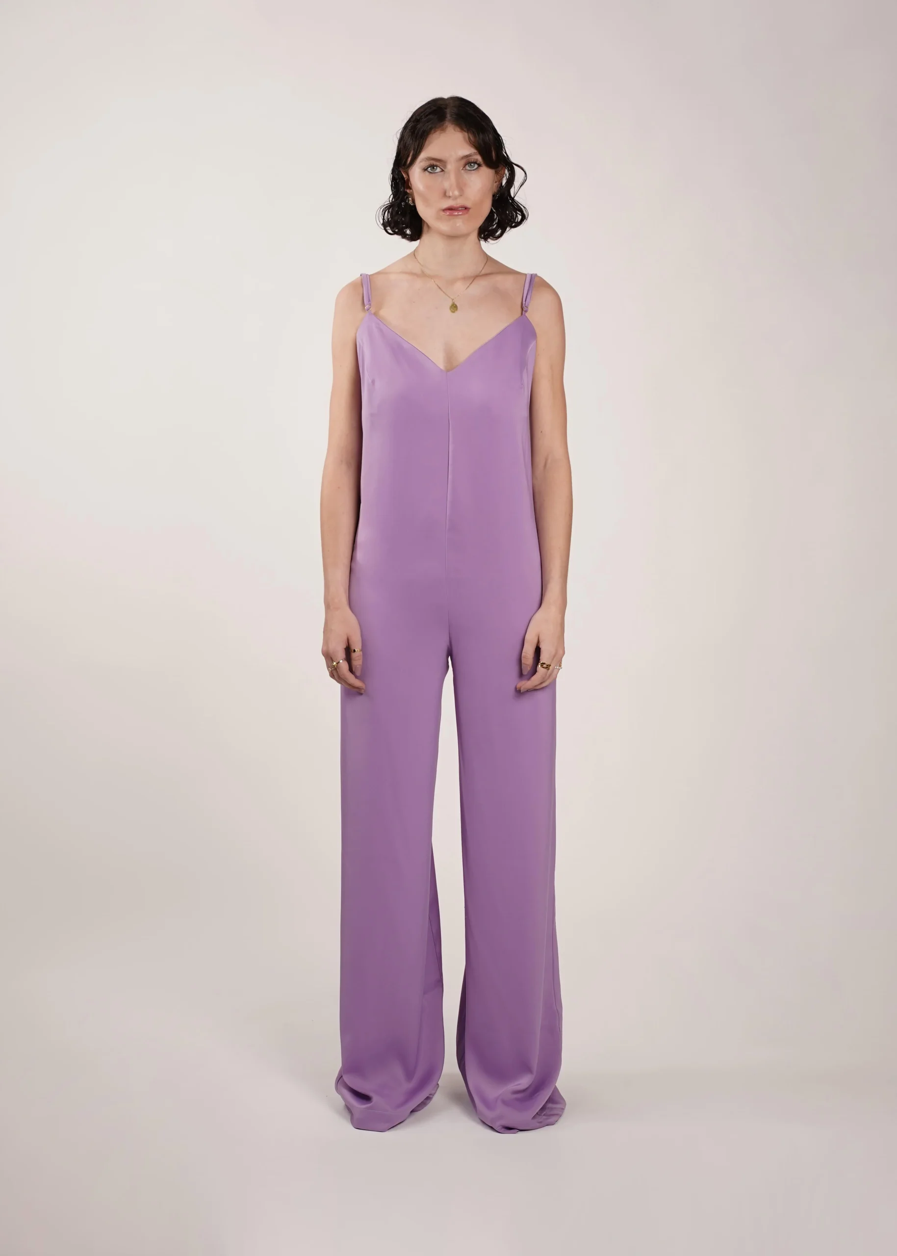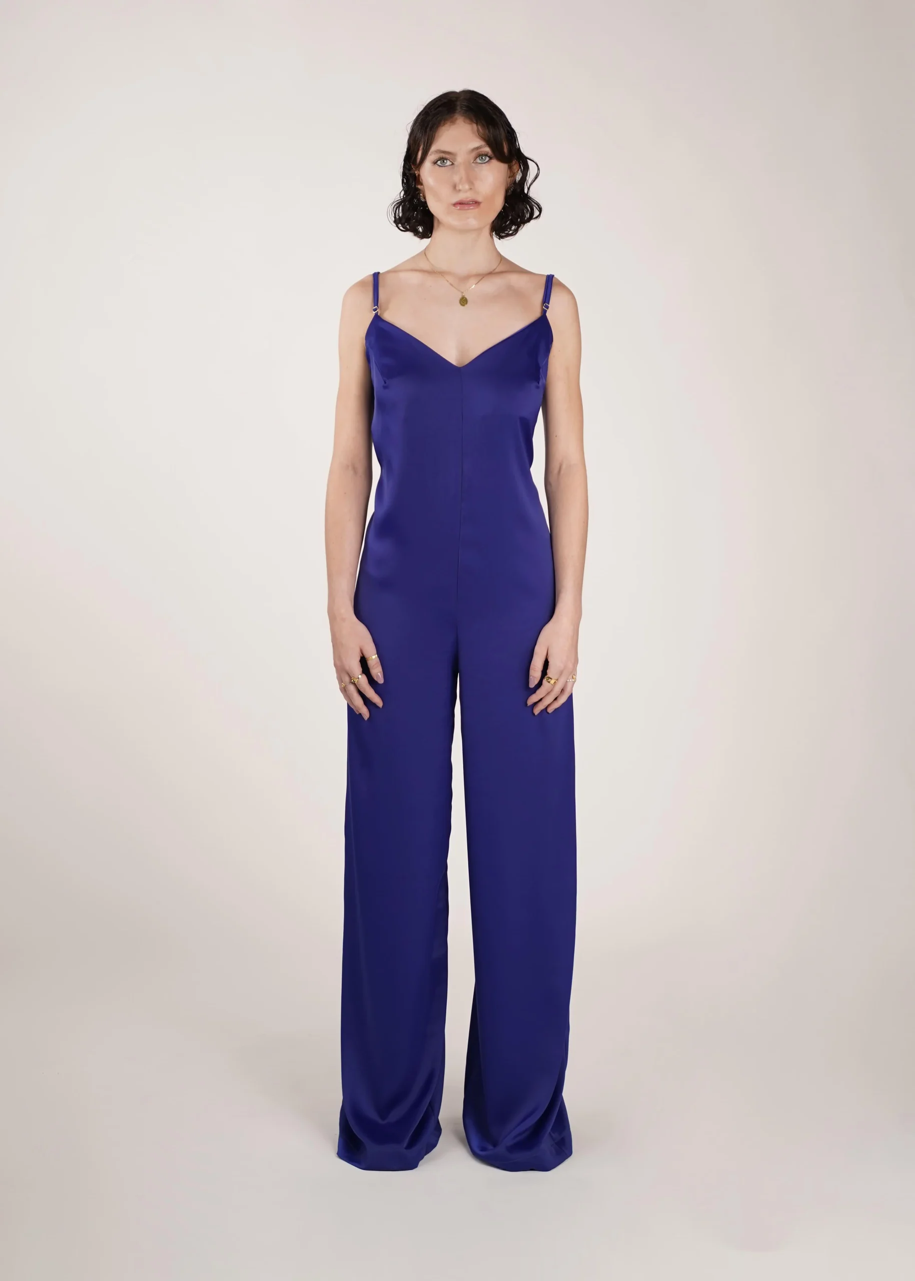 Combinaison ample jambes longues, bretelles réglables. Dos nu et décolleté, ourlet en bas de jambe.