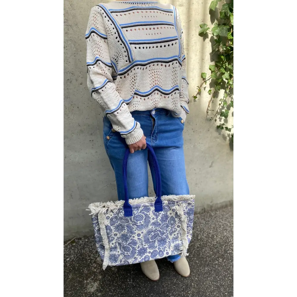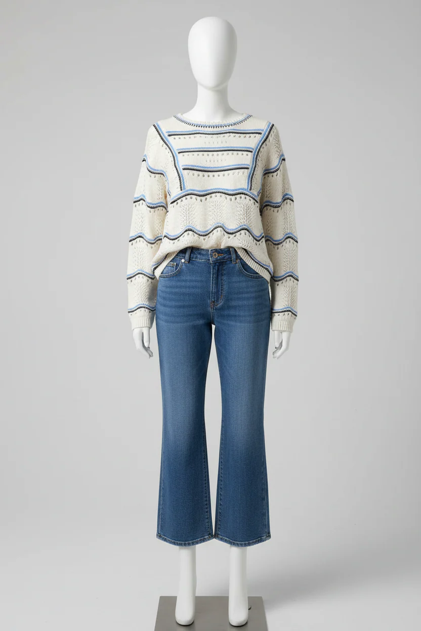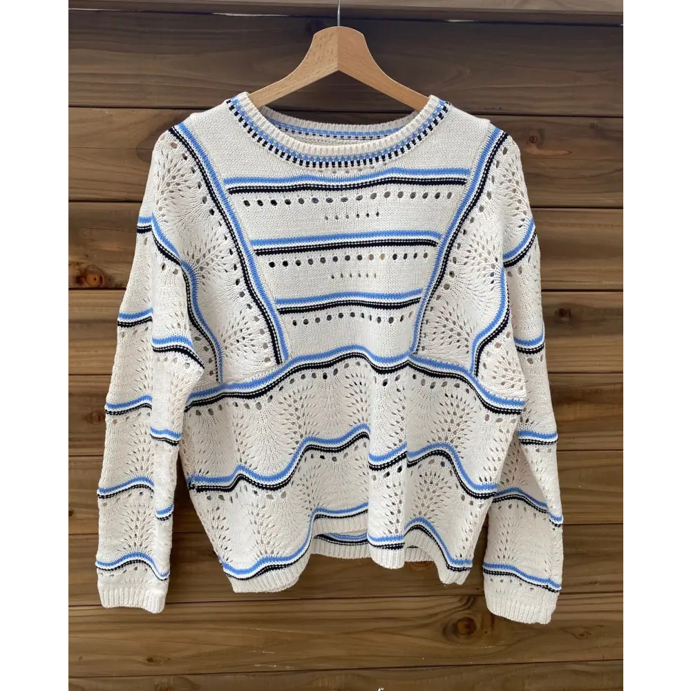 Ce pull en maille légère rayée bleu et écru mixe à merveille confort, fraîcheur et allure casual chic.