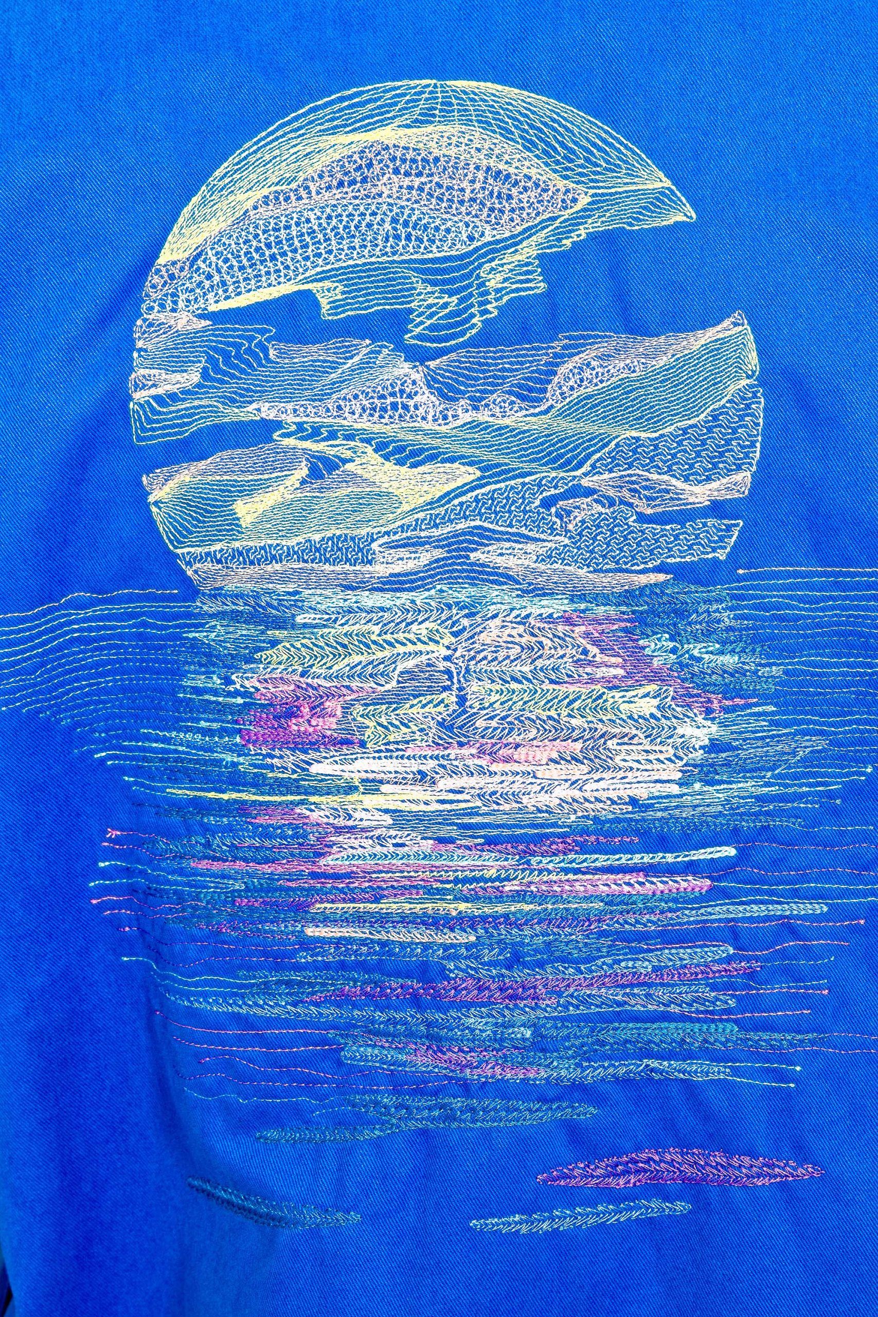 La méditation des journées estivales, s’exprime ici, avec douceur, par notre broderie « coucher de soleil ». Le soleil, source de vie, puissance créatrice, astre du jour et de la lumière qu’on ne cesse d’admirer, comme un réservoir d’énergie vitale, et de chaleur. Une force régénératrice autant qu’appaisante.