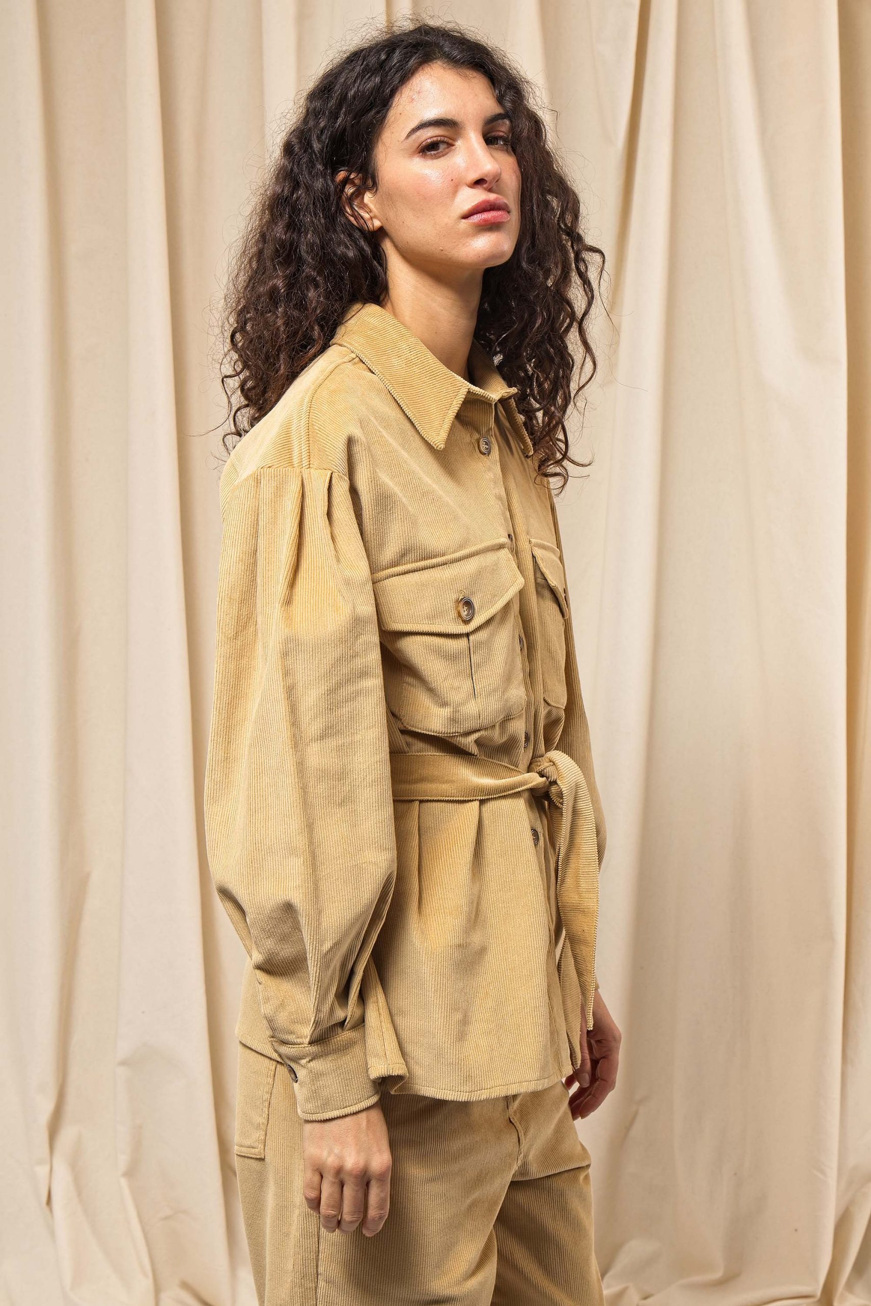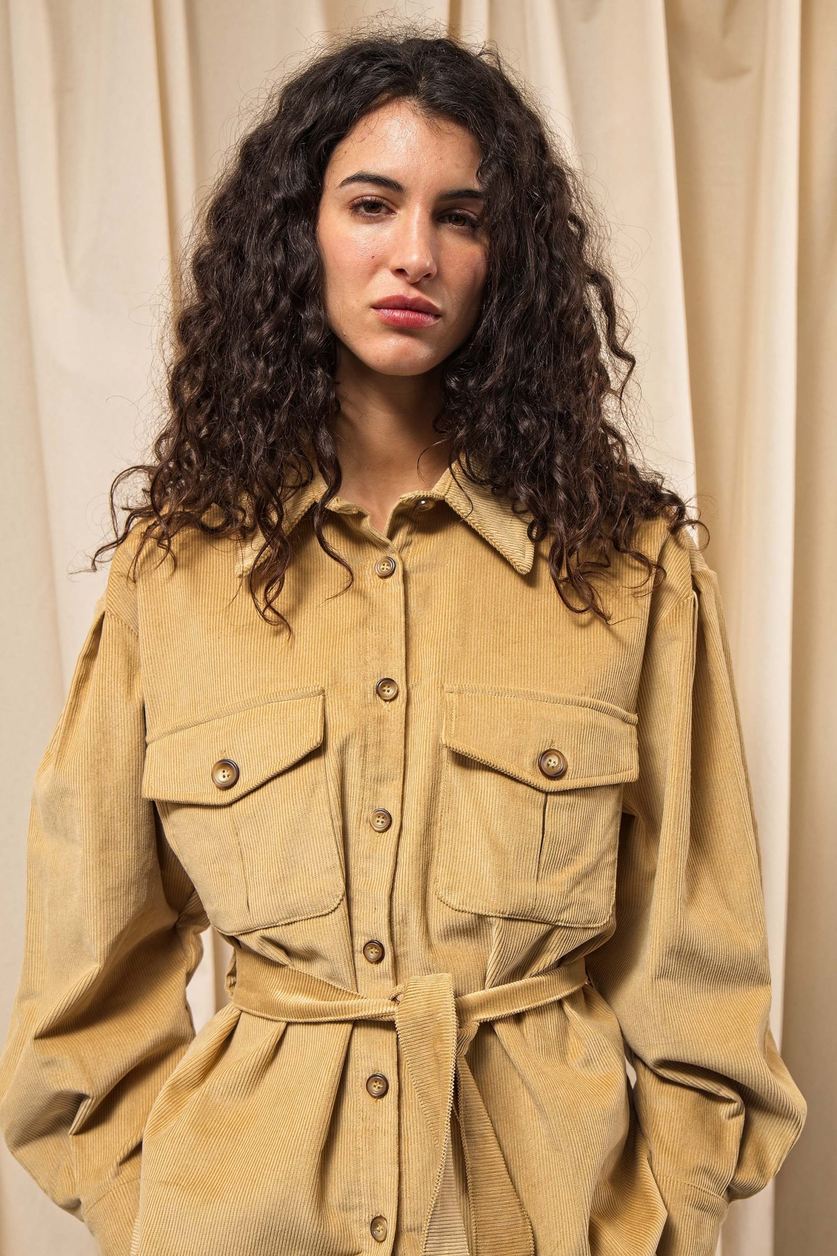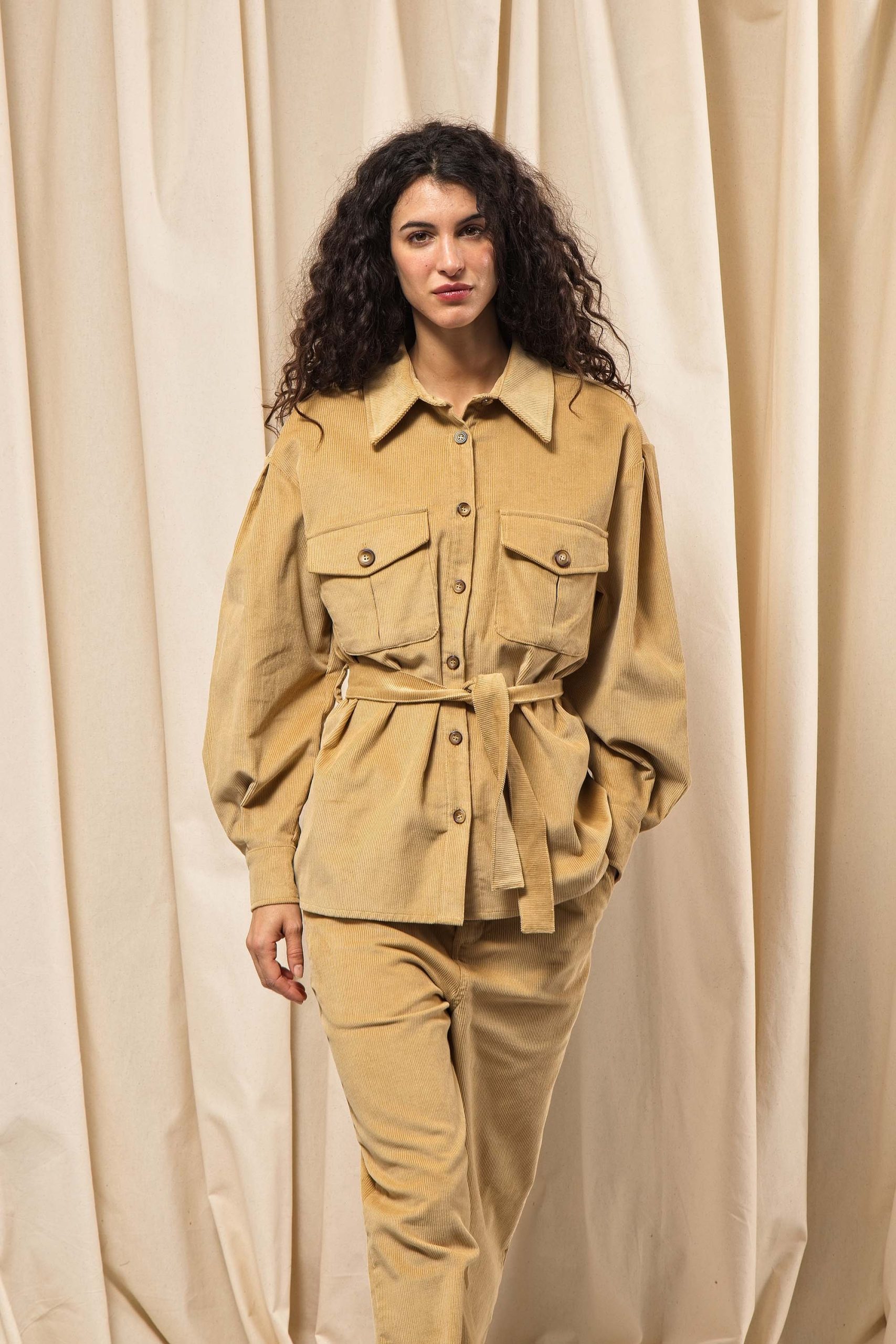 SURCHEMISE BEIGE EN VELOURS COTELÉ TAILLE CEINTURÉE