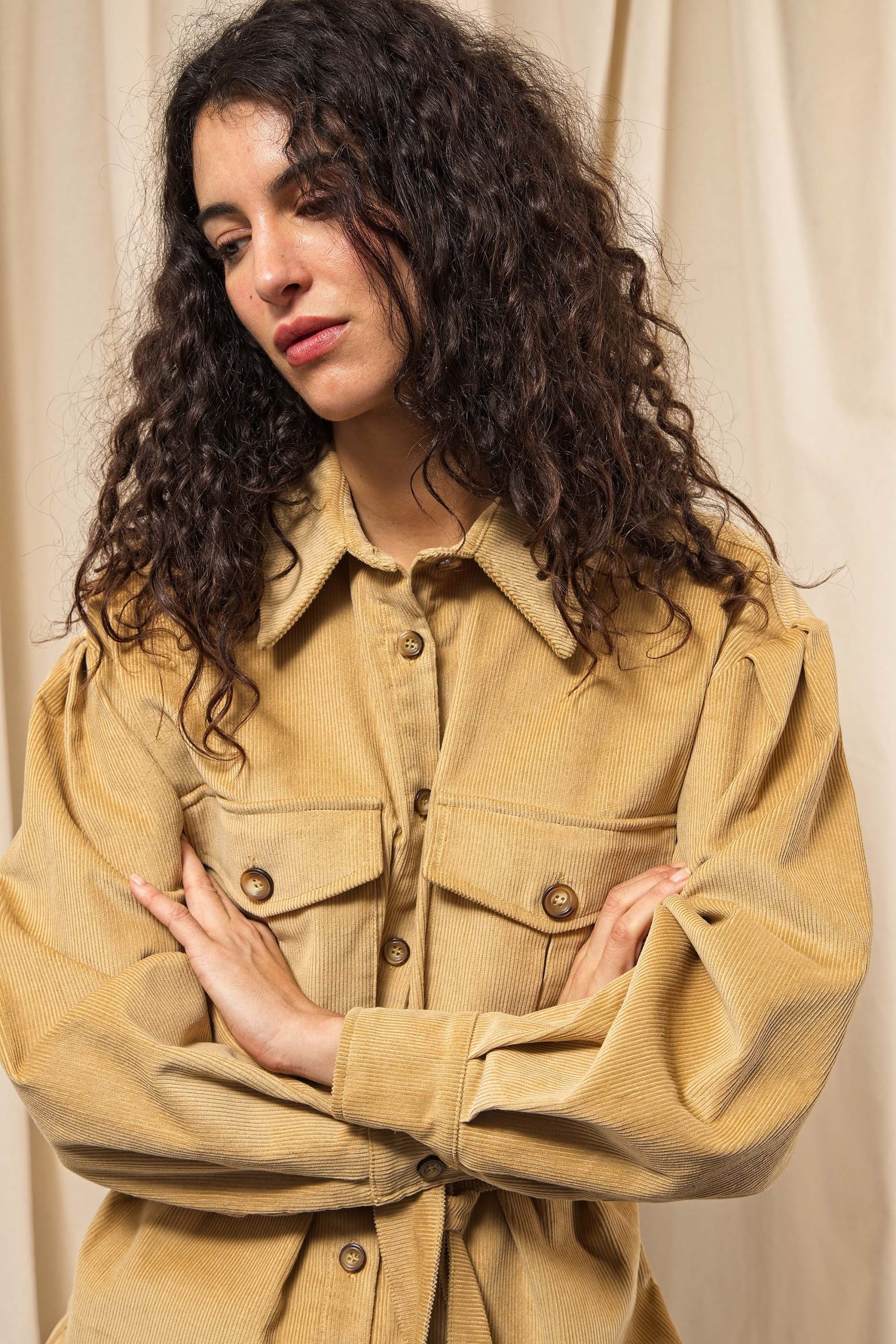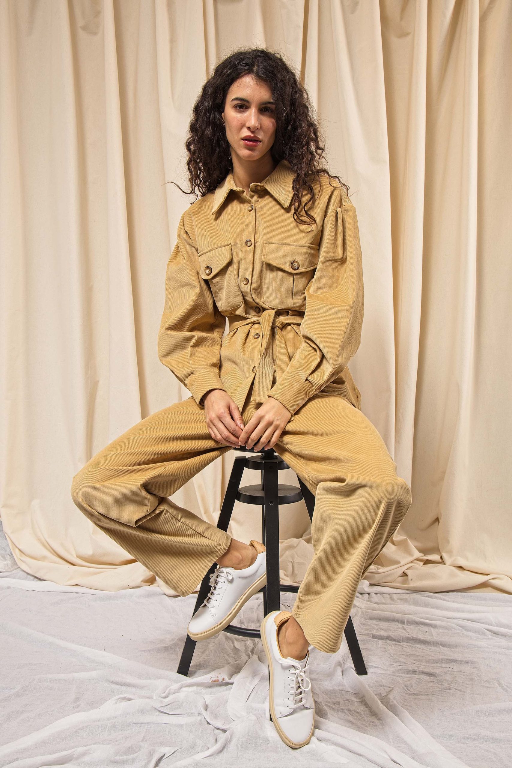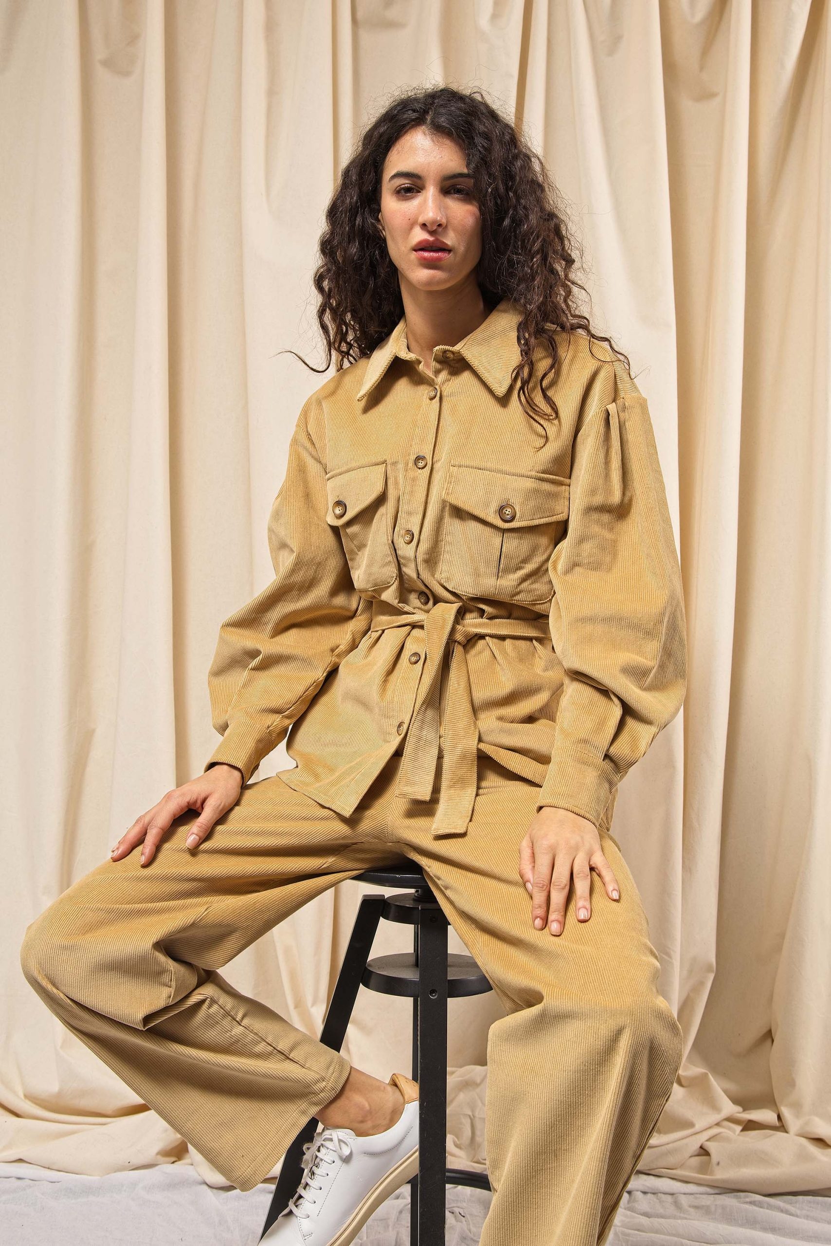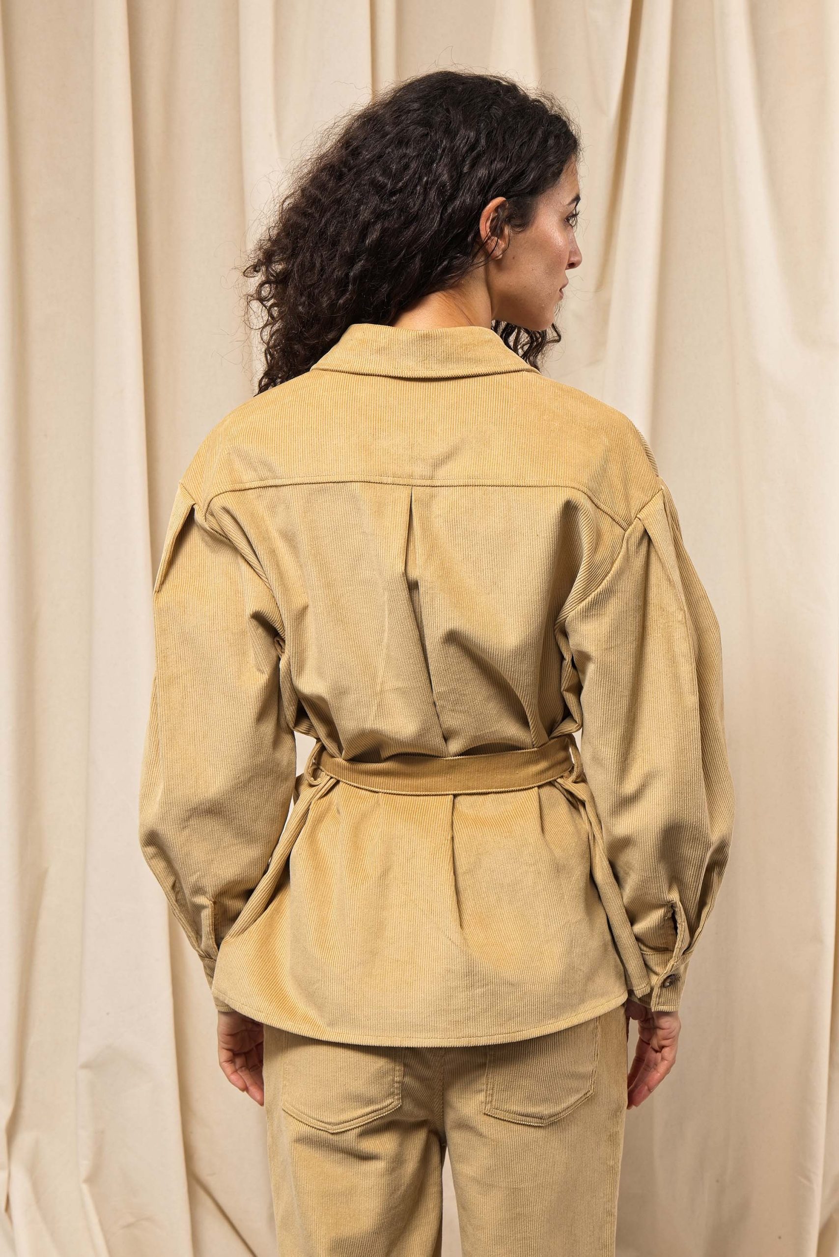 SURCHEMISE BEIGE EN VELOURS COTELÉ TAILLE CEINTURÉE