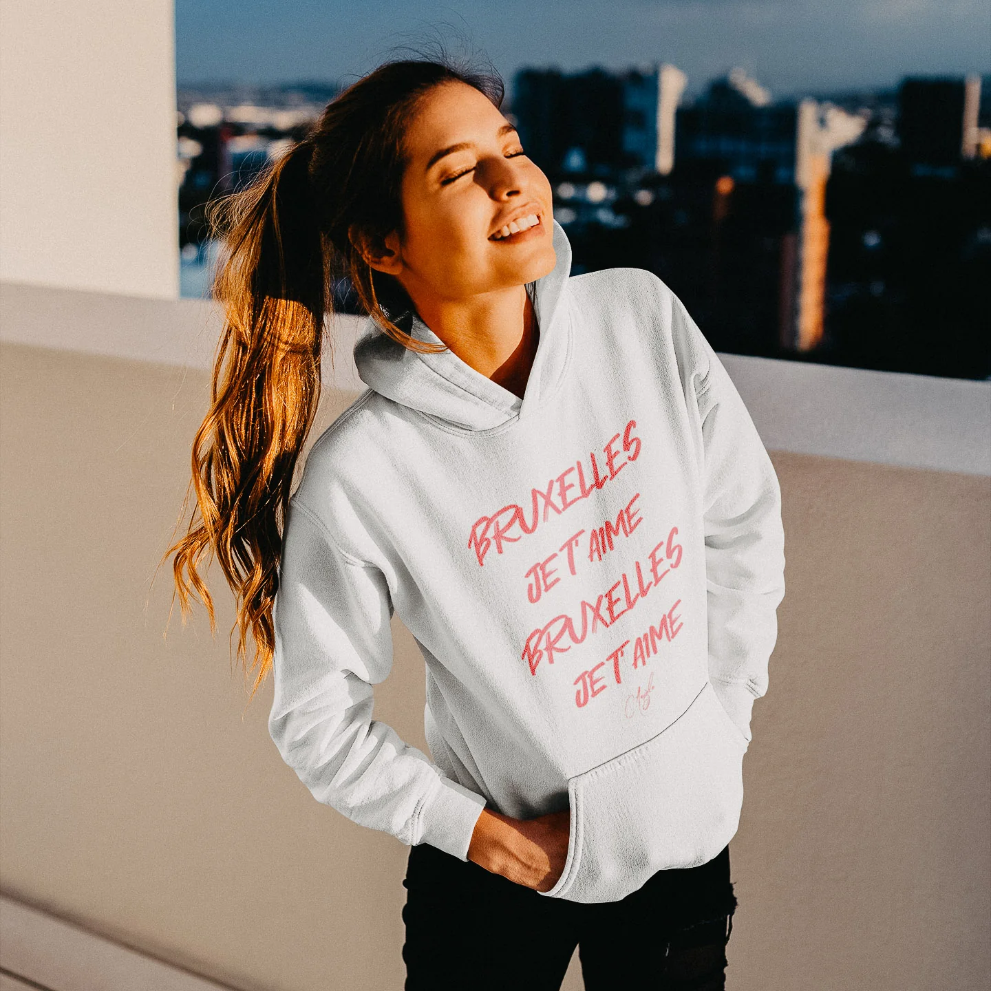 Achetez dès maintenant notre pull à capuche femme « BRUXELLES JE T’AIME » et ajoutez une touche de style belge à votre garde-robe !