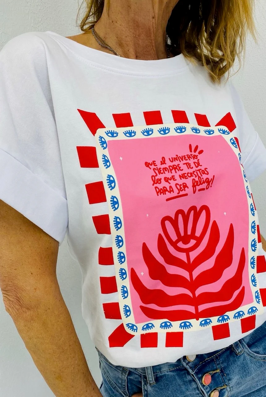 Un t-shirt qui te booste le moral rien qu’en le regardant ! Avec son imprimé graphique et son message plein de good vibes en espagnol – « Que el universo siempre te dé lo que necesitas para ser feliz » – il insuffle de l’énergie et de la couleur à ta tenue.