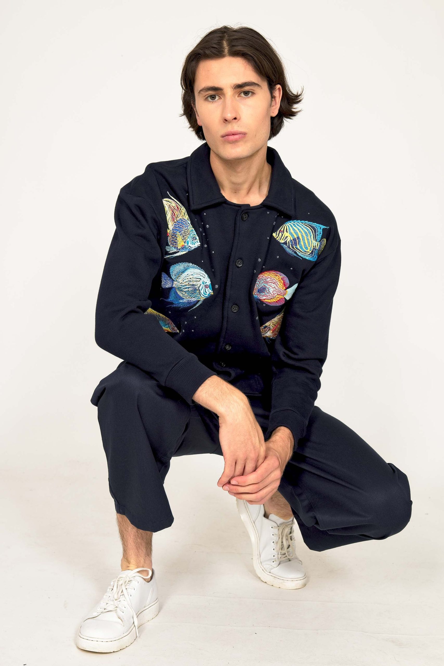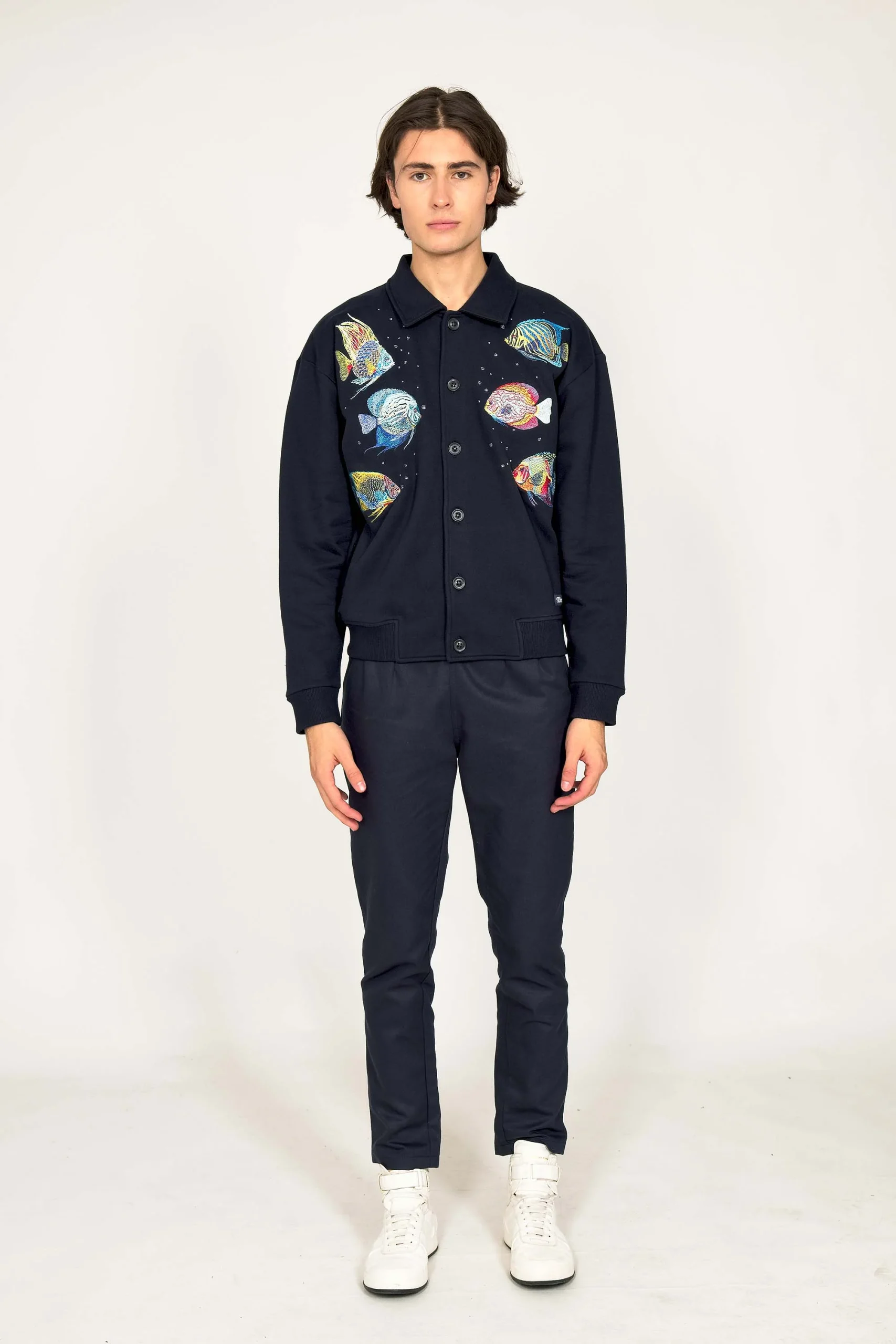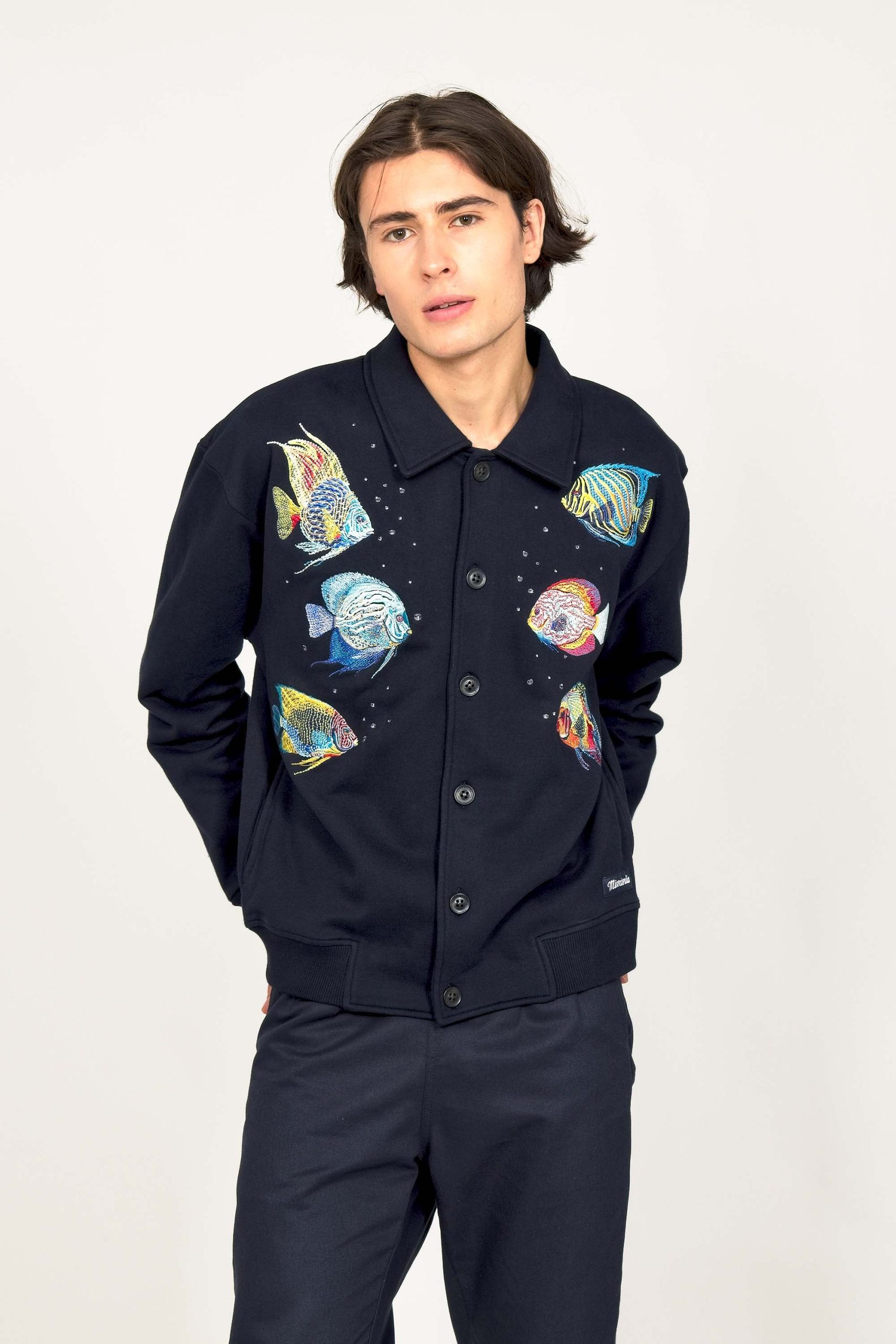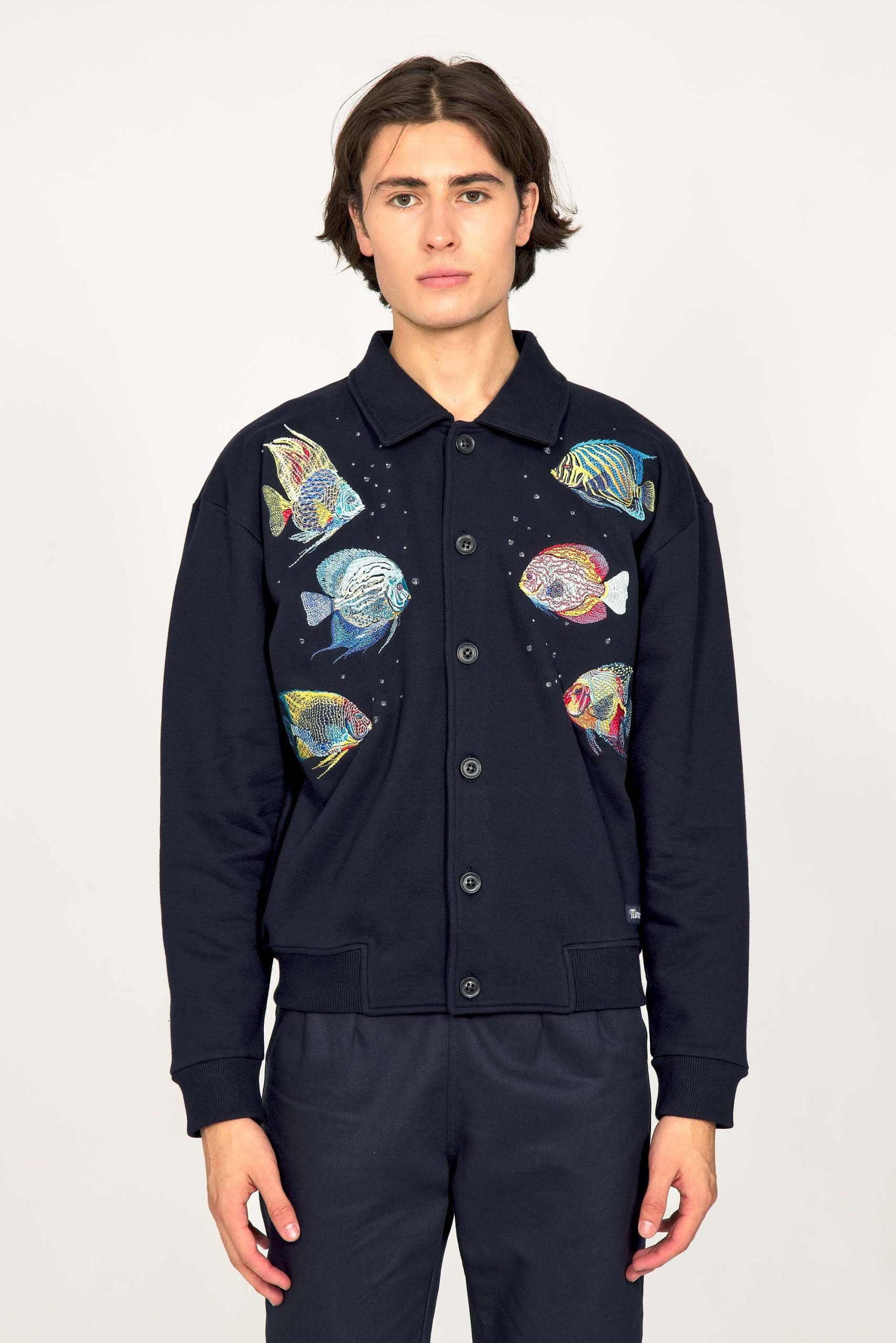 VESTE BOUTONNÉE BLEU MARINE EN MOLLETON BRODERIE POISSONS