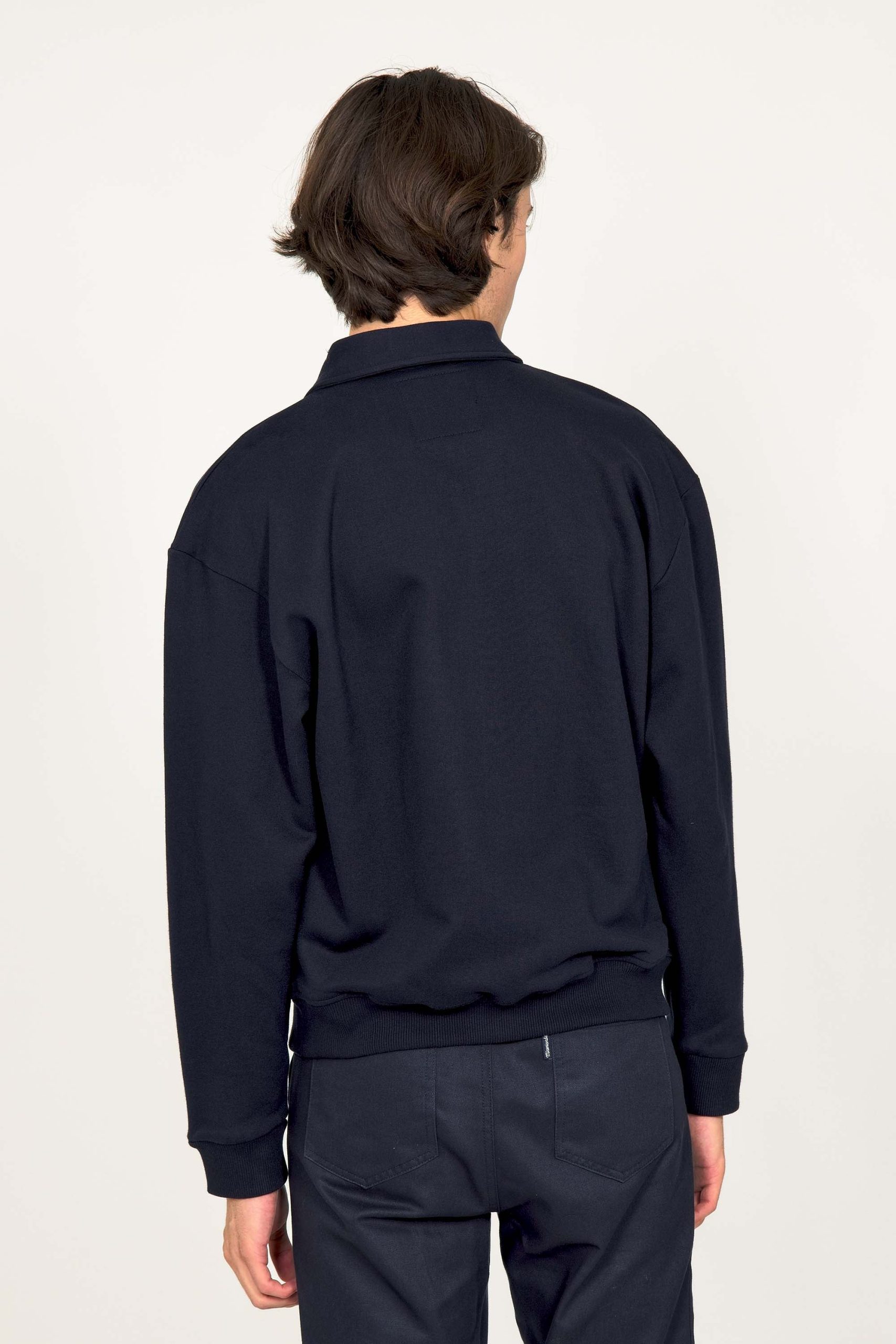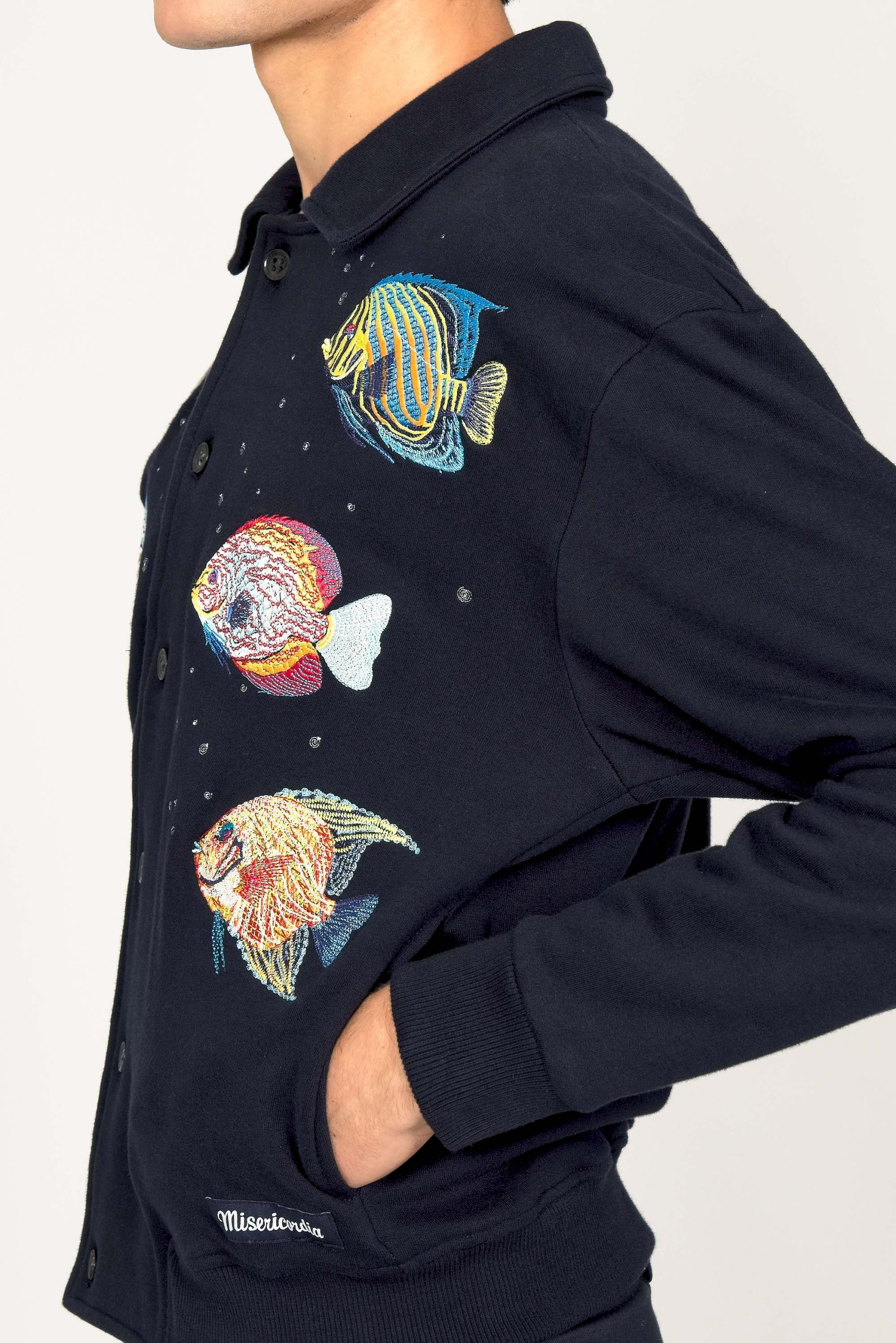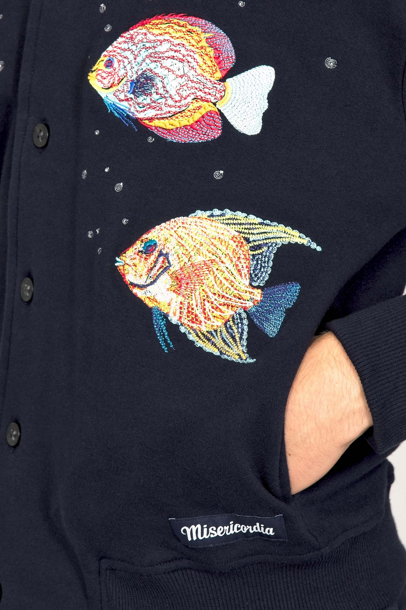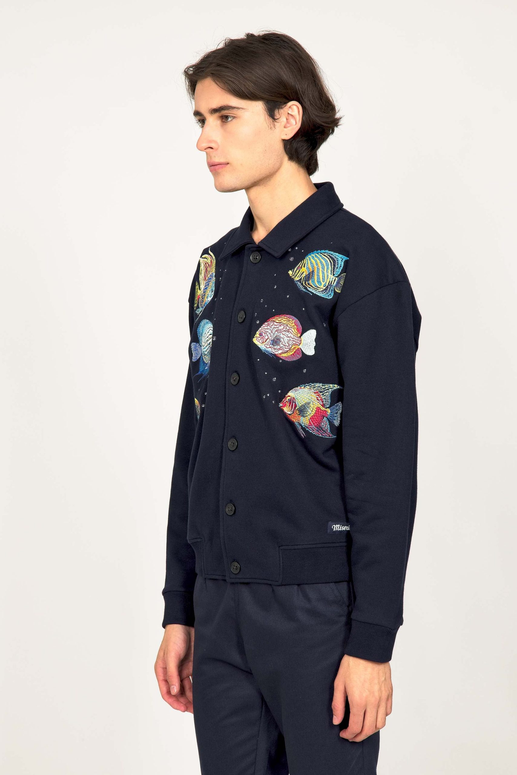 VESTE BOUTONNÉE BLEU MARINE EN MOLLETON BRODERIE POISSONS